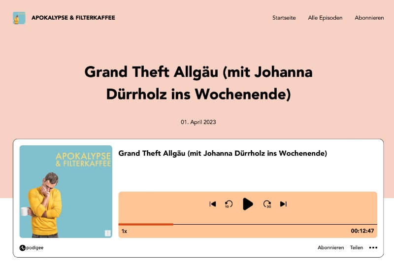 Schon vor längerer Zeit hatte Micky Beisenherz Johanna Dürrholz in seinen Podcast "Apokalypse & Filterkaffee" eingeladen. Am heutigen Samstag ist es soweit: Johanna Dürrholz begleitet Micky mit den interessanten und witzigen Themen der letzten Tage ins Wochenende.
