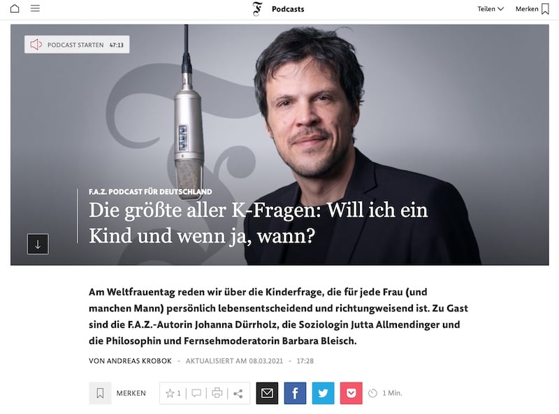 Am Weltfrauentag spricht Andreas Krobok über die Kinderfrage, die für jede Frau (und manchen Mann) persönlich lebensentscheidend und richtungweisend ist. Zu Gast in seinem Podcast der FAZ sind die F.A.Z.-Autorin Johanna Dürrholz, die Soziologin Jutta Allmendinger und die Philosophin und Fernsehmoderatorin Barbara Bleisch.