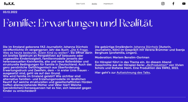 Zu ihrem Themenabend "Familie: Erwartung und Realität" hatte die Förderunion Kunst und Kultur, kurz F.U.K.K., die Autorin als Referentin in ihre Heimatstadt Meppen eingeladen. Im Jugendzentrum JAM berichtete sie über ihre Recherchen und beteiligte sich an der Diskussion zum genannten Thema. Der Talk ist auch auf YouTube noch zu sehen!