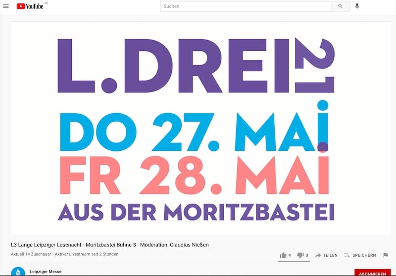 Am 28.5.21 nahm Johanna Dürrholz an der "L3 Langen Leipziger Lesenacht" teil. Dort wurde sie auf der Moritzbastei Bühne 3 von Moderator Claudius Nießen interviewt und las dann Passagen aus ihrem Buch vor (ab ca. 3:57:00). Die Sendung wurde per Livestream übertragen und kann noch bis September angeschaut werden.