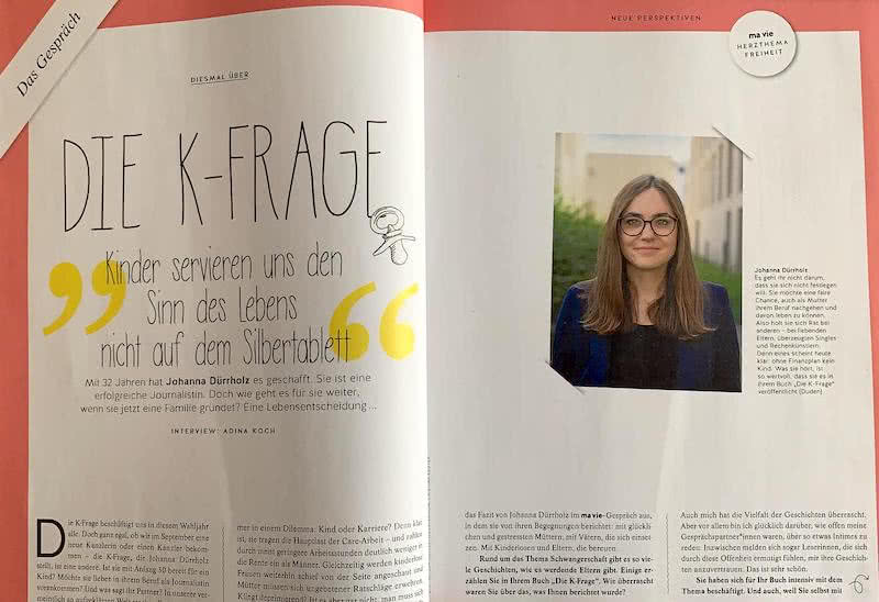 Adina Koch hat sich mit Johanna Dürrholz über ihr Buch unterhalten und stellt sie im Magazin MA VIE vor. Das Magazin richtet sich an "Frauen von heute, die an morgen denken". Die Ausgabe 'Ich bin so FREI' ist einzeln beim Burda-Verlag bestellbar.
