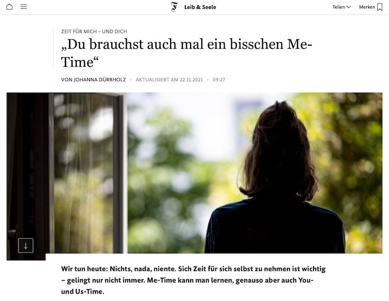 Johanna Dürrholz philosophiert über die Bedeutung von Zeit, die man für sich selbst, für jemand anderen oder auch gemeinsam braucht - gerade in Zeiten der Pandemie. Der Artikel ist bei 'FAZ.NET' frei verfügbar.