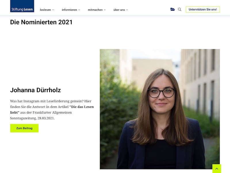 Johanna Dürrholz wurde für den renommierten Dietrich Oppenberg - Medienpreis 2021 für ihren Beitrag "Die das Lesen liebt" (FAS, 28.03.2021) nominiert.