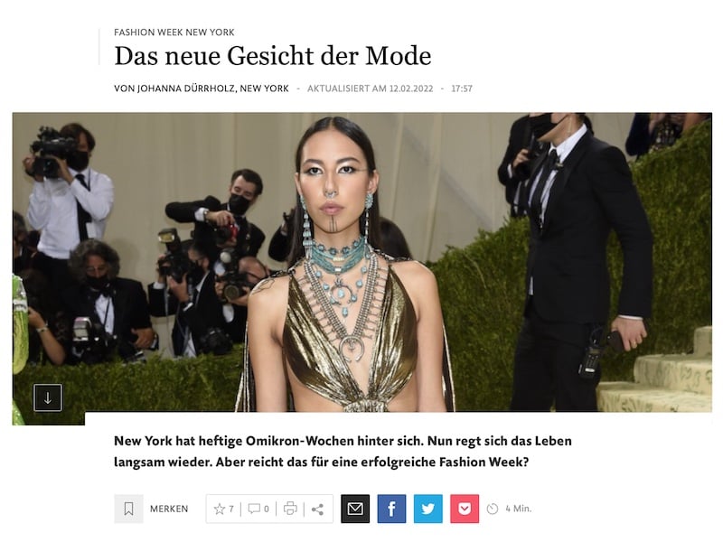 Aus New York berichtet Johanna Dürrholz über die Fashion Week 2022 und beschäftigt sich in dem Artikel "Das neue Gesicht der Mode" mit neuen New Yorker Modetrends. Der Artikel ist bei 'FAZ.NET' frei verfügbar.