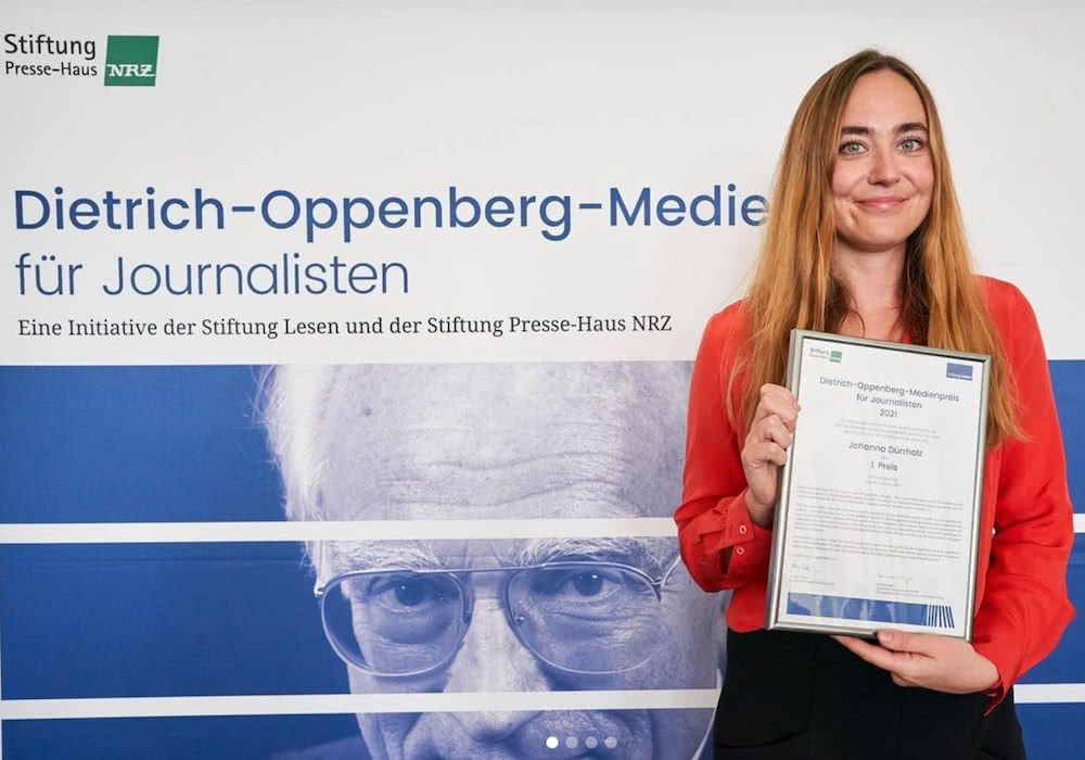 Johanna Dürrholz hat den 1. Preis des Dietrich-Oppenberg-Medienpreises 2021 der Stiftung Lesen für ihren Beitrag "Die das Lesen liebt" (FAS, 28.03.2021) gewonnen. Der Preis wurde in der Staatskanzlei Brandenburg von Bildungsministerin Britta Ernst verliehen.