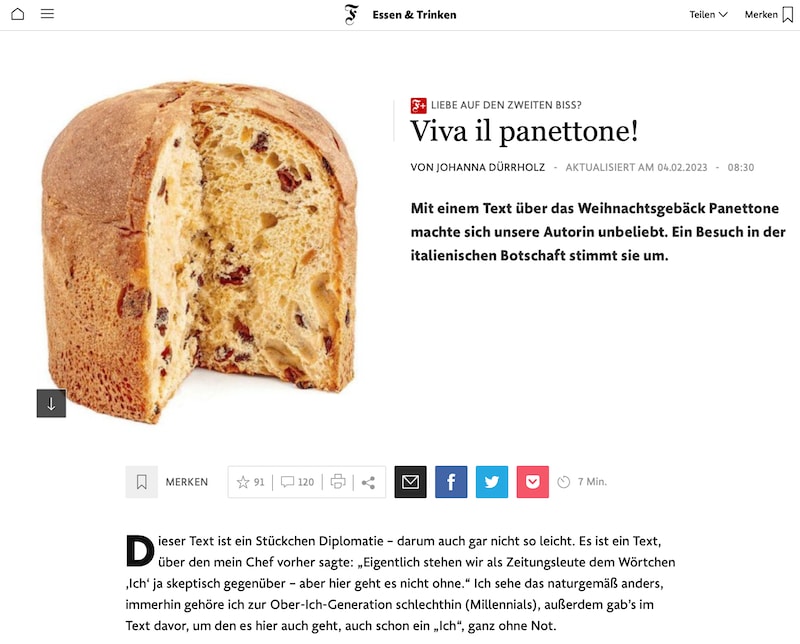 "Mit einem Text über das Weihnachtsgebäck Panettone machte sich unsere Autorin unbeliebt. Ein Besuch in der italienischen Botschaft stimmt sie um." Ein wahrer Shitstorm war über die Autorin ob ihrer Kritik am italienischen Kuchen ("Warum zur Hölle Panettone?")kurz vor Weihnachten hereingebrochen. Dem Artikel folgte besagte Einladung zum Treffen mit dem italienischen Ernährungsminister und einem Abend mit vielen italienischen Köstlichkeiten. Dem folgte dann besagter Versuch einer Versöhnung Anfang Februar.